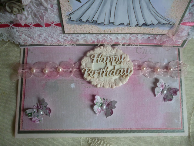 The double bow is created from two beautiful fluted edge sheer organza ribbons from the ribbon girl. The sentiment wrapped wooden spool and beautiful cluney lace are from Live and Love Crafts.